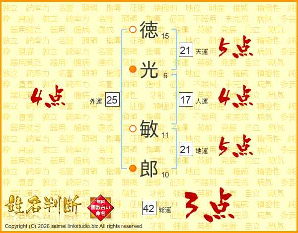 徳(15画)光(6画) 敏(11画)郎(10画)