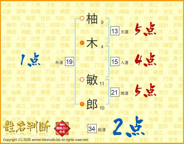 柚(9画)木(4画) 敏(11画)郎(10画)