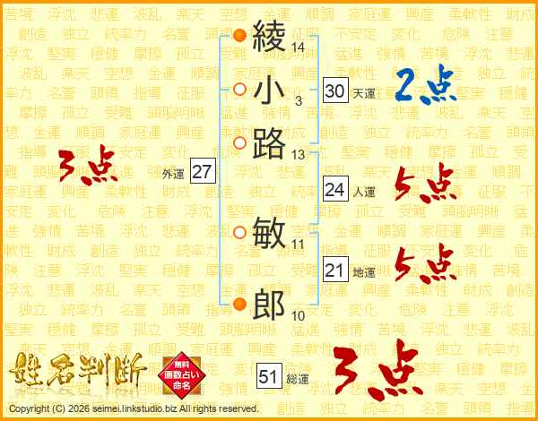 綾(14画)小(3画)路(13画) 敏(11画)郎(10画)