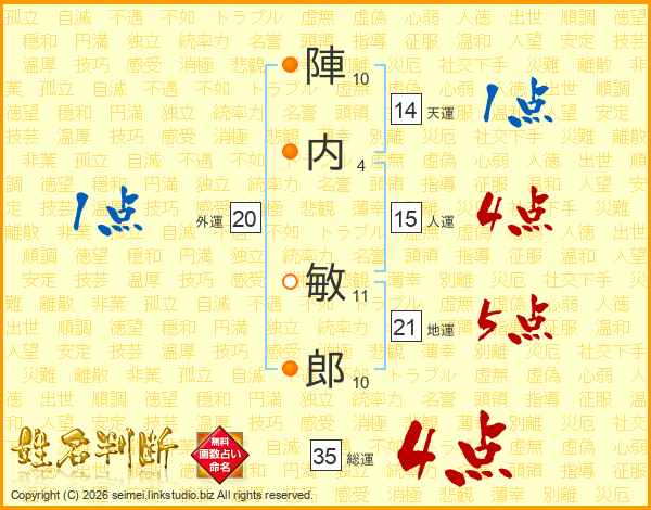 陣(10画)内(4画) 敏(11画)郎(10画)