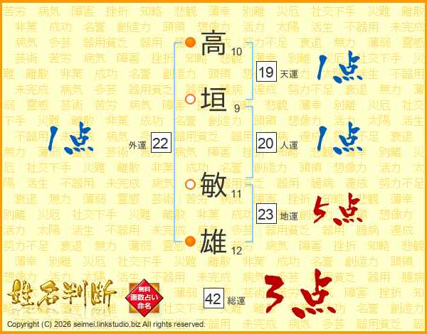 高(10画)垣(9画) 敏(11画)雄(12画)