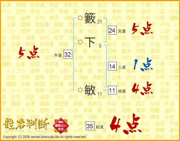 生活面を象徴する運勢です。外部から受ける影響力を表し、結婚運、家庭運や職場、環境への順応性を表します。総運から人運を引いた画数。姓や名が1文字の場合を除く。