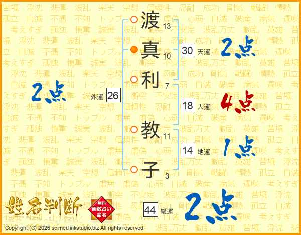 渡(13画)真(10画)利(7画) 教(11画)子(3画)