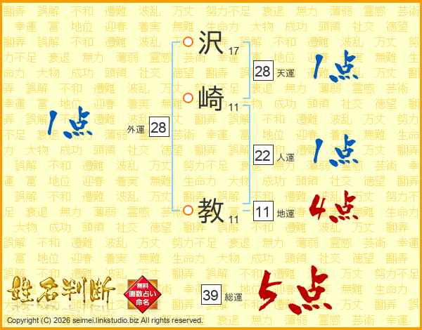 生活面を象徴する運勢です。外部から受ける影響力を表し、結婚運、家庭運や職場、環境への順応性を表します。総運から人運を引いた画数。姓や名が1文字の場合を除く。