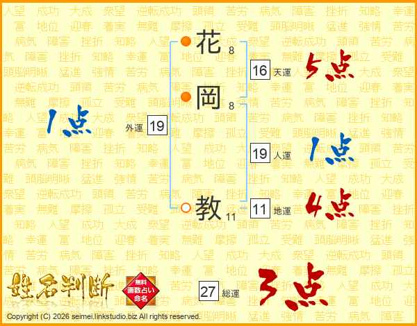 あなたの人生を表す1番重要な運勢です。生涯を通じて影響する総合運となり、主に50歳以降の晩年期に影響を及ぼします。苗字と名前の合計画数。