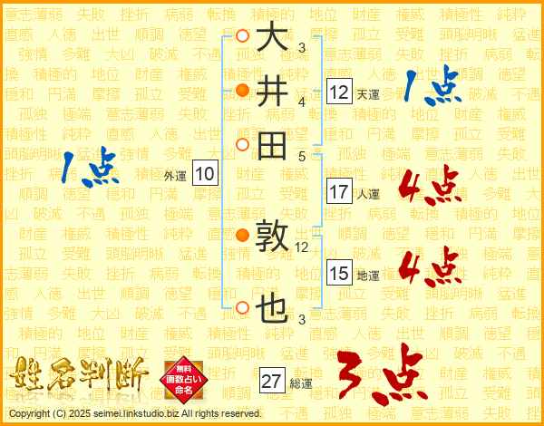 大(3画)井(4画)田(5画) 敦(12画)也(3画)