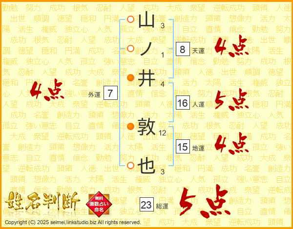 山(3画)ノ(1画)井(4画) 敦(12画)也(3画)