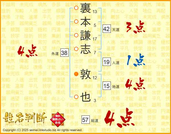 裏(13画)本(5画)謙(17画)志(7画) 敦(12画)也(3画)