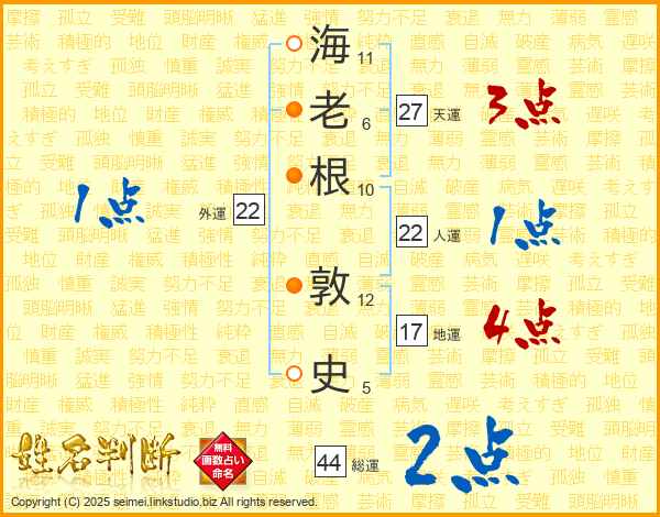 海(11画)老(6画)根(10画) 敦(12画)史(5画)