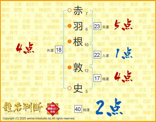 赤(7画)羽(6画)根(10画) 敦(12画)史(5画)