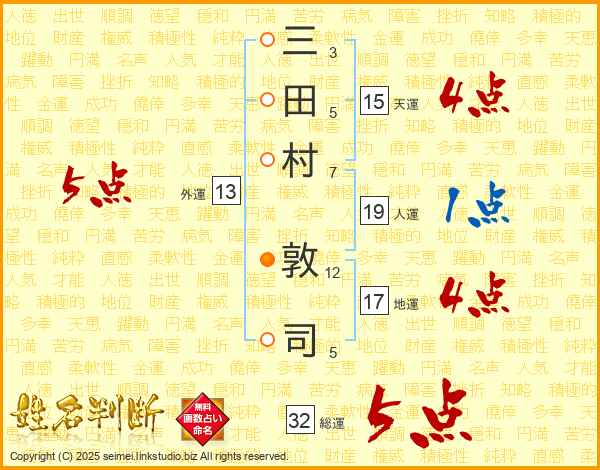 三(3画)田(5画)村(7画) 敦(12画)司(5画)