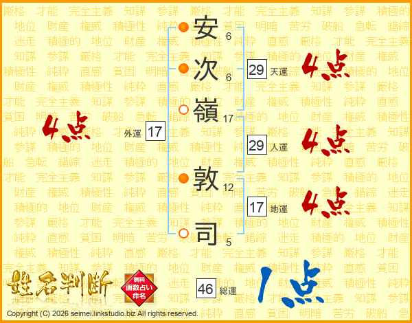 安(6画)次(6画)嶺(17画) 敦(12画)司(5画)