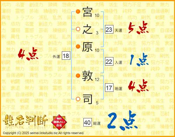 宮(10画)之(3画)原(10画) 敦(12画)司(5画)