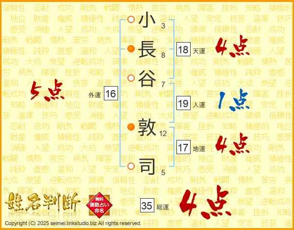 小(3画)長(8画)谷(7画) 敦(12画)司(5画)