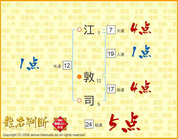 生活面を象徴する運勢です。外部から受ける影響力を表し、結婚運、家庭運や職場、環境への順応性を表します。総運から人運を引いた画数。姓や名が1文字の場合を除く。