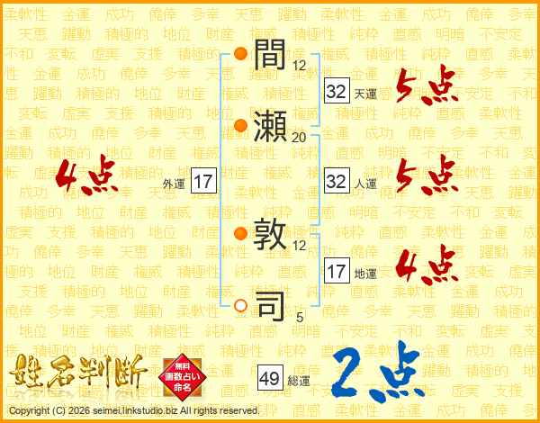 間瀬敦司さんの総運は49画の2点!