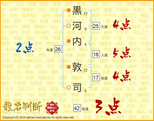 黒(12画)河(9画)内(4画) 敦(12画)司(5画)