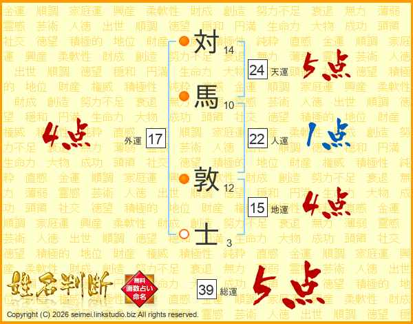 生活面を象徴する運勢です。外部から受ける影響力を表し、結婚運、家庭運や職場、環境への順応性を表します。総運から人運を引いた画数。姓や名が1文字の場合を除く。