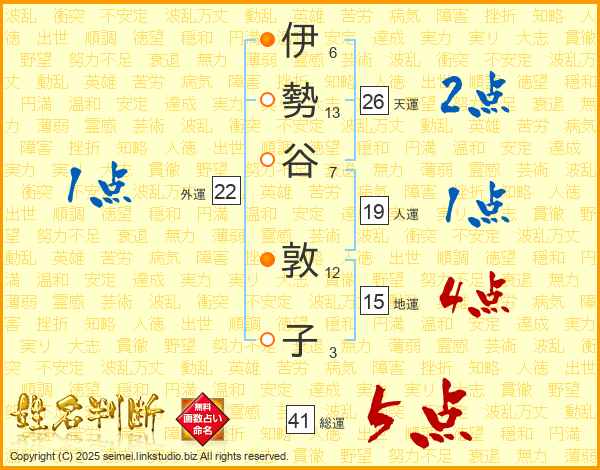 伊(6画)勢(13画)谷(7画) 敦(12画)子(3画)