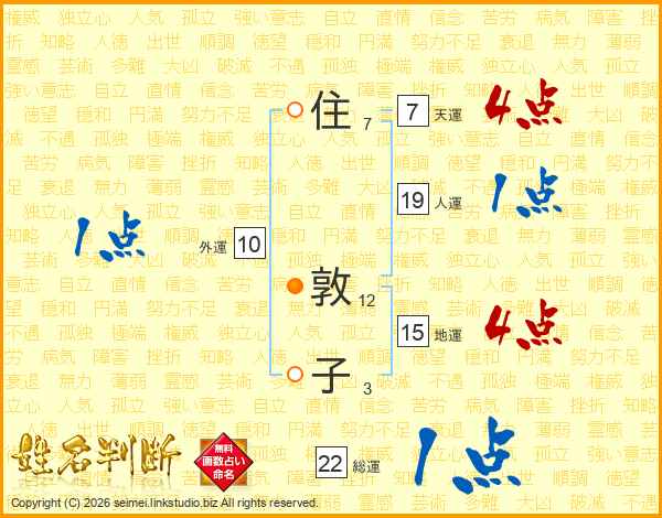 生活面を象徴する運勢です。外部から受ける影響力を表し、結婚運、家庭運や職場、環境への順応性を表します。総運から人運を引いた画数。姓や名が1文字の場合を除く。