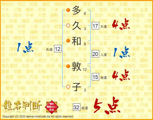 多(6画)久(3画)和(8画) 敦(12画)子(3画)