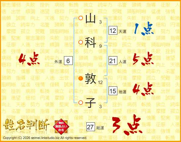 山(3画)科(9画) 敦(12画)子(3画)