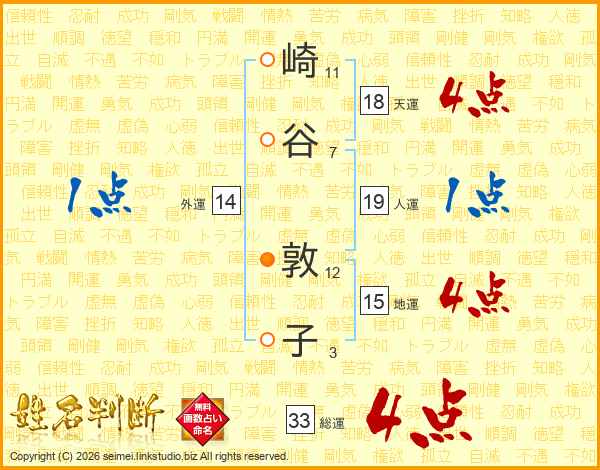 崎(11画)谷(7画) 敦(12画)子(3画)