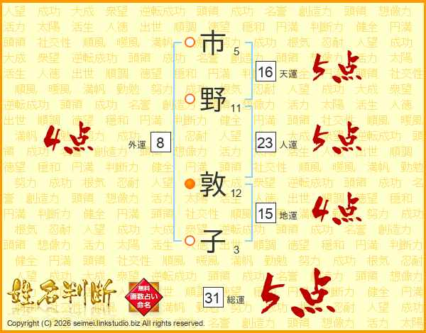 あなたの人生を表す1番重要な運勢です。生涯を通じて影響する総合運となり、主に50歳以降の晩年期に影響を及ぼします。苗字と名前の合計画数。