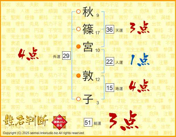 秋(9画)篠(17画)宮(10画) 敦(12画)子(3画)