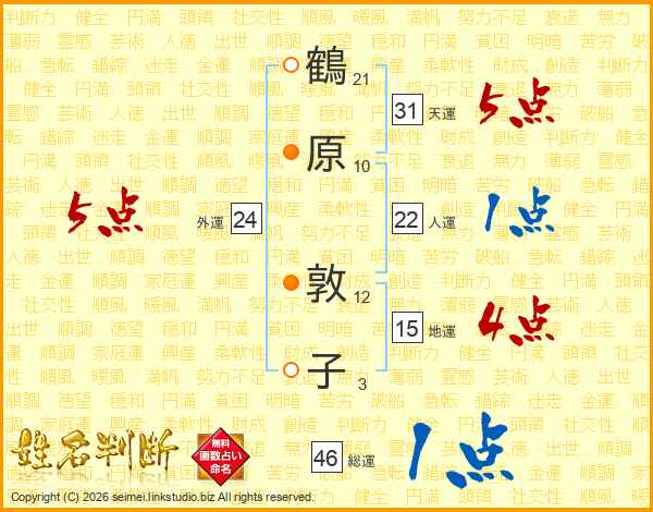 鶴(21画)原(10画) 敦(12画)子(3画)
