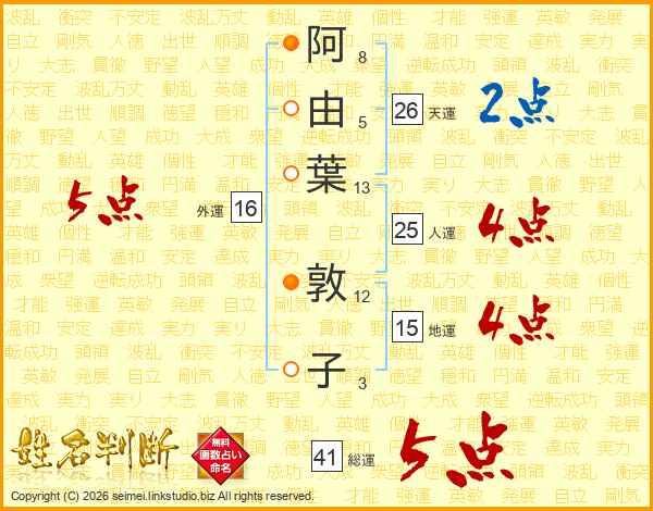 阿由葉敦子さんの総運は41画の5点!