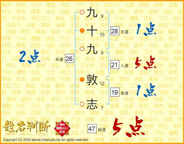 九(9画)十(10画)九(9画) 敦(12画)志(7画)