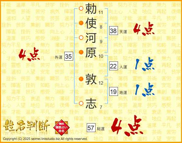 勅(11画)使(8画)河(9画)原(10画) 敦(12画)志(7画)