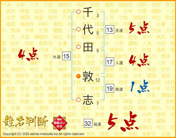 千(3画)代(5画)田(5画) 敦(12画)志(7画)