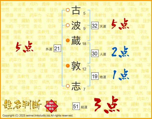 古(5画)波(9画)蔵(18画) 敦(12画)志(7画)