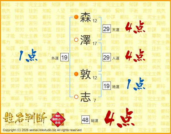 森(12画)澤(17画) 敦(12画)志(7画)