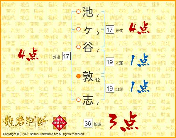 池(7画)ヶ(3画)谷(7画) 敦(12画)志(7画)