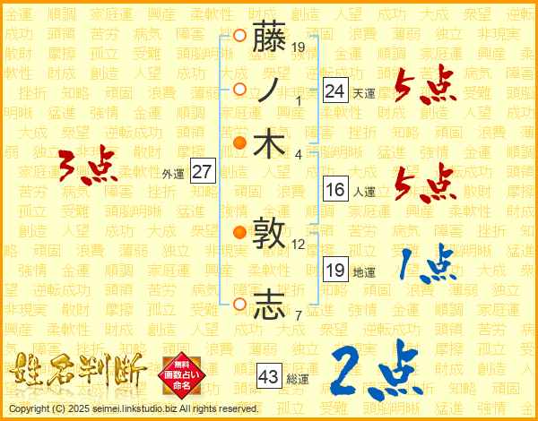 藤(19画)ノ(1画)木(4画) 敦(12画)志(7画)