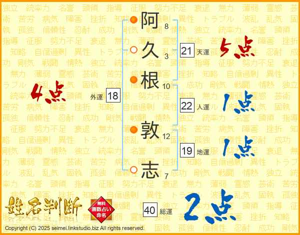 阿久根敦志さんの天運は21画の5点!