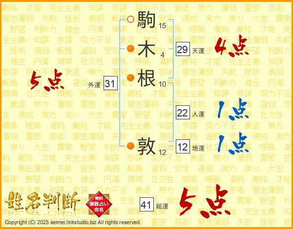 駒木根敦さんの総運は41画の5点!