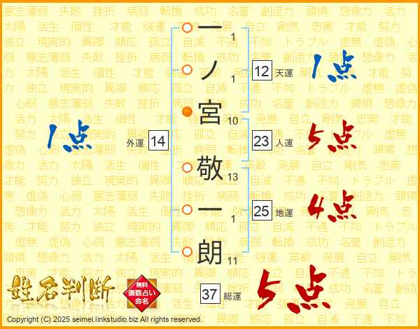 一(1画)ノ(1画)宮(10画) 敬(13画)一(1画)朗(11画)