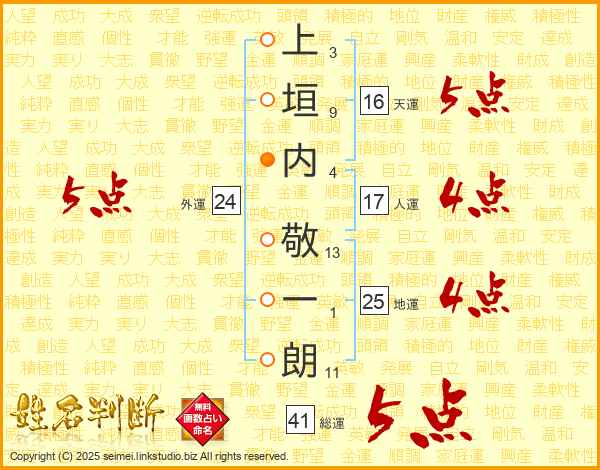上(3画)垣(9画)内(4画) 敬(13画)一(1画)朗(11画)