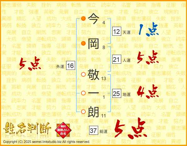 今(4画)岡(8画) 敬(13画)一(1画)朗(11画)