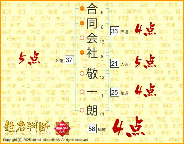 合(6画)同(6画)会(13画)社(8画) 敬(13画)一(1画)朗(11画)