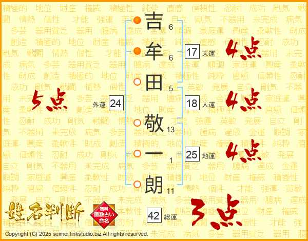 吉(6画)牟(6画)田(5画) 敬(13画)一(1画)朗(11画)