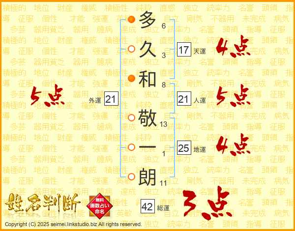 生活面を象徴する運勢です。外部から受ける影響力を表し、結婚運、家庭運や職場、環境への順応性を表します。総運から人運を引いた画数。姓や名が1文字の場合を除く。