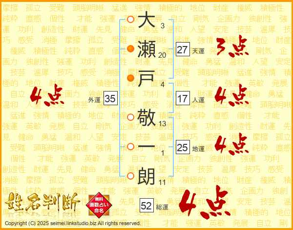 大(3画)瀬(20画)戸(4画) 敬(13画)一(1画)朗(11画)