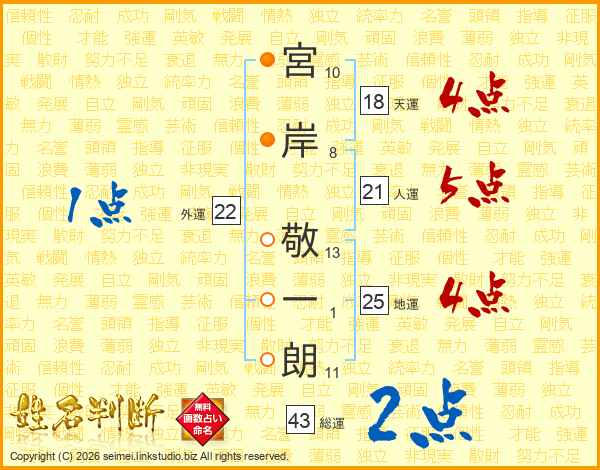 宮(10画)岸(8画) 敬(13画)一(1画)朗(11画)