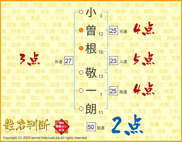 小(3画)曽(12画)根(10画) 敬(13画)一(1画)朗(11画)