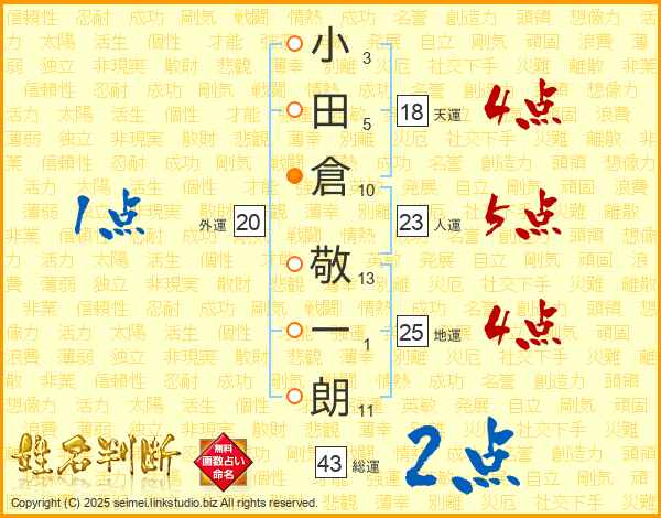小(3画)田(5画)倉(10画) 敬(13画)一(1画)朗(11画)